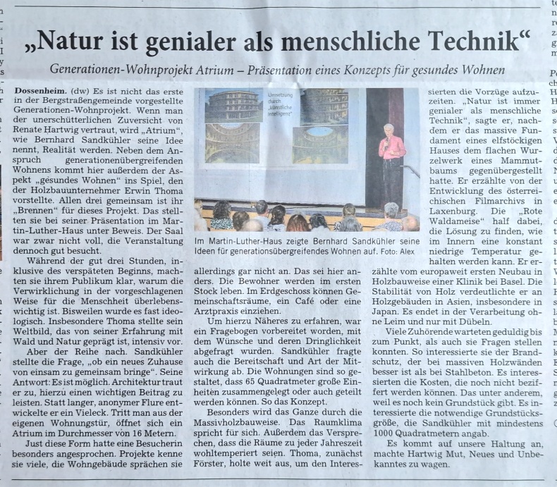 Der österreichische Holzbau-Pionier Erwin Thoma war anwesend und berichtete mit großer Fachkompetenz darüber, wie seine Bauweise auch von genial konstruierten und natürlich klimatisierten Ameisenbauten inspiriert ist. Auch die natürliche Verankerung höchster Bäume mit geringem Wurzel-Aufwand beschrieb Thoma und wie der Erntezeitpunkt des Holzes sich auf seinen Zuckergehalt auswirkt und damit auf nicht-Anfälligkeit für Feuchtigkeit, Schimmel und Insektenfraß. All das ist bei Thomas "Holz100" praktisch ausgeschlossen. Bei Isolation gegen Hitze und Kälte erreicht Thoma Holz100 Bestwerte, ebenso bei Schutz vor Schall und elektromagnetischer Strahlung - und all das bei rein natürlichen Materialien ohne jede Chemie. Sogar im Brandschutz ist Thomas Bauweise vorbildlich. Der Alptraum einer hochgiftig brennenden üblichen Isolierung wird hier einfach NICHT verbaut, die massiven Holzwände sind sehr schwer entflammbar.